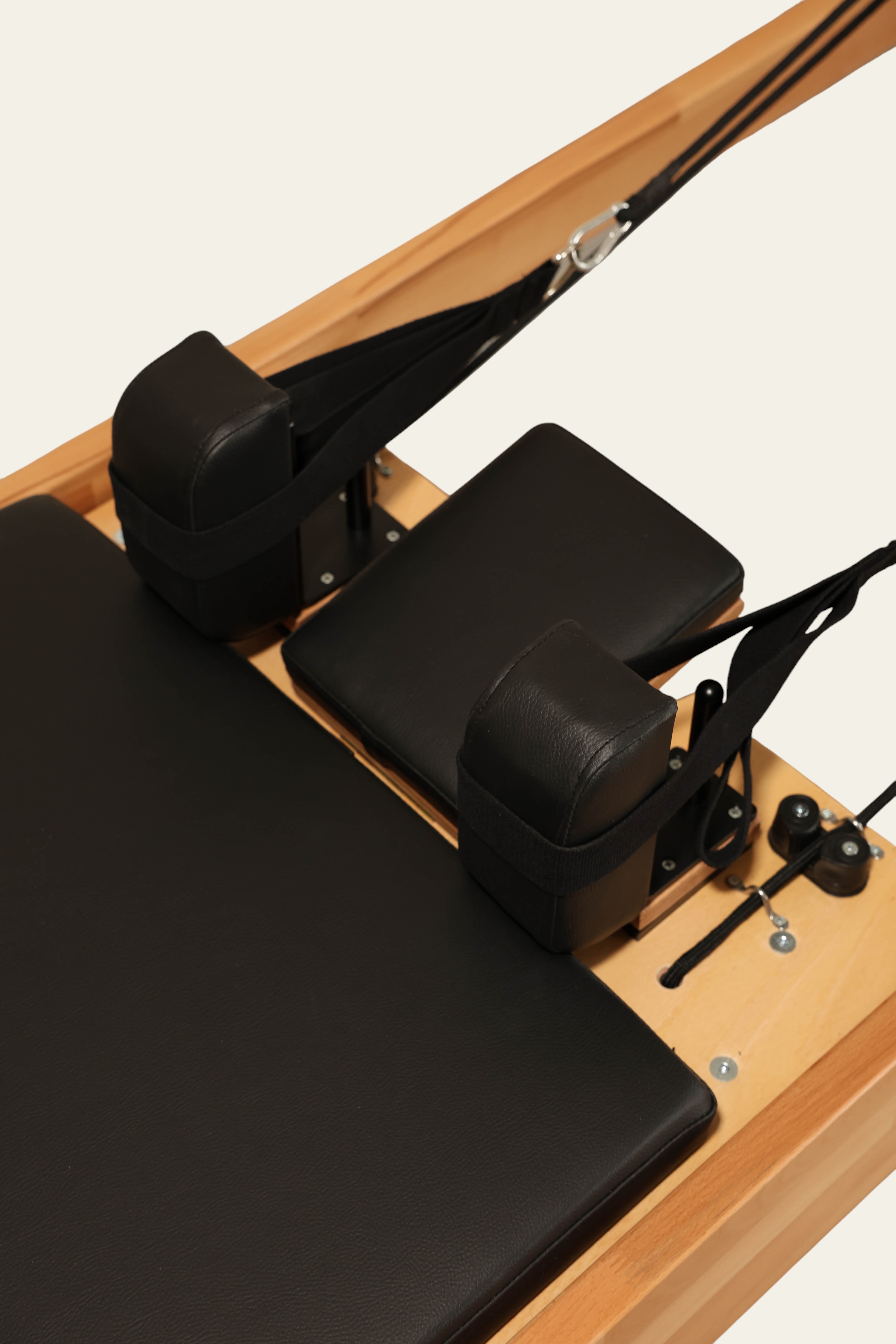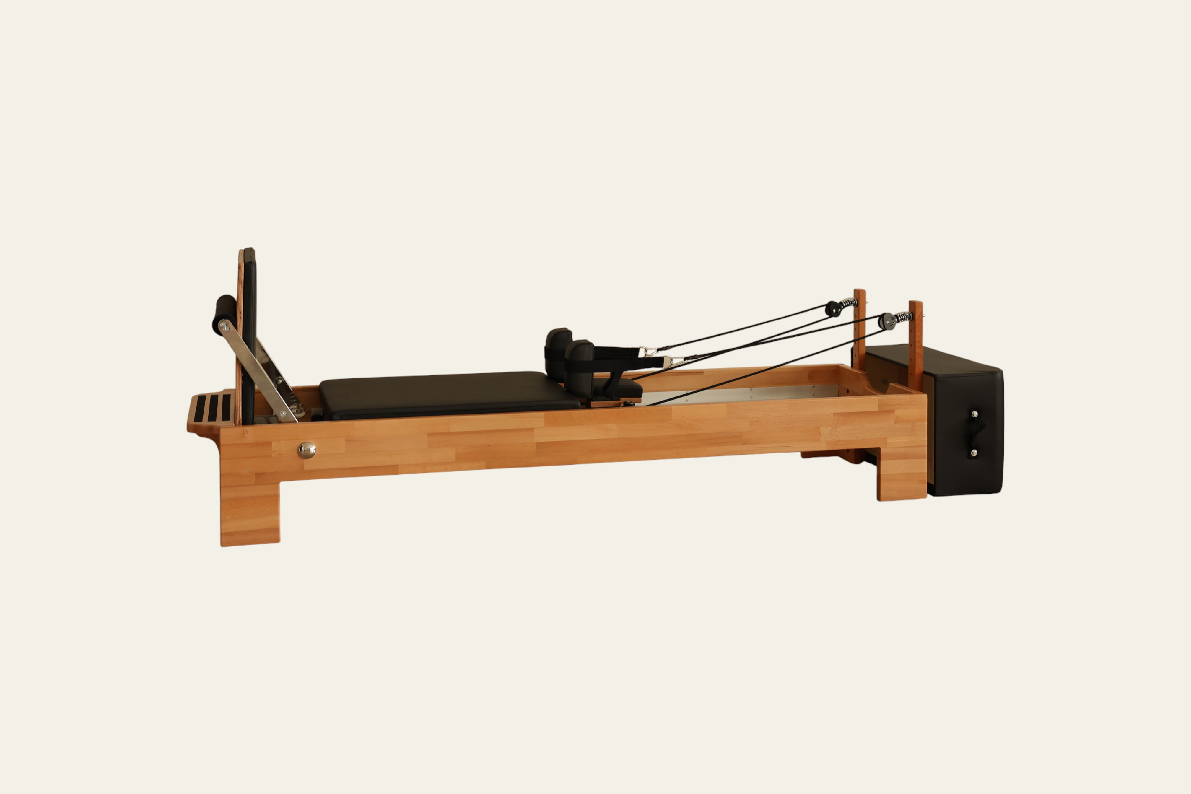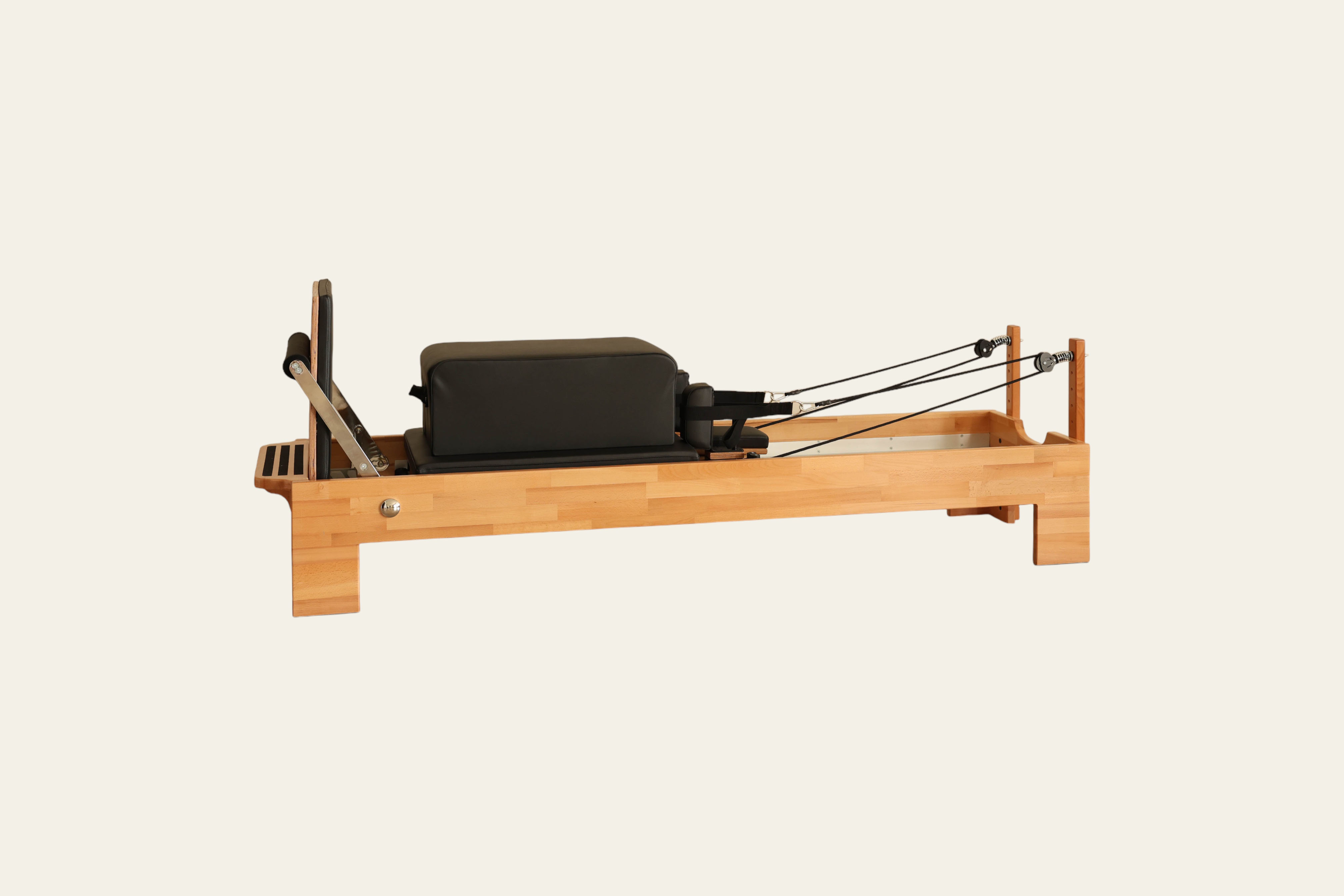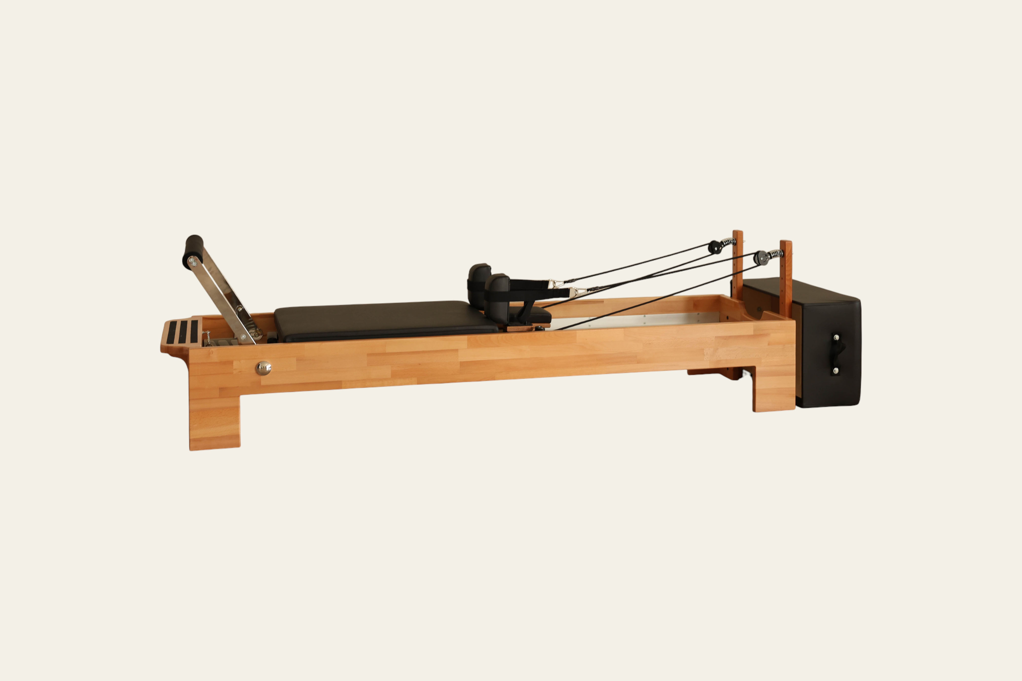 Thanks to the high-density EVA padding, non-slip marine leather upholstery, and mechanism supported by silicone wheels, the Tower Reformer delivers a comfortable, balanced, and smooth Pilates experience.